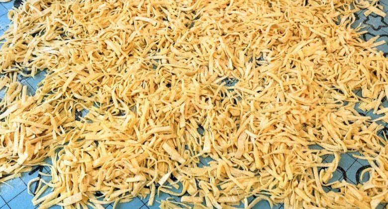 Posiekany makaron rozkładamy i oprószamy lekko mąką.
