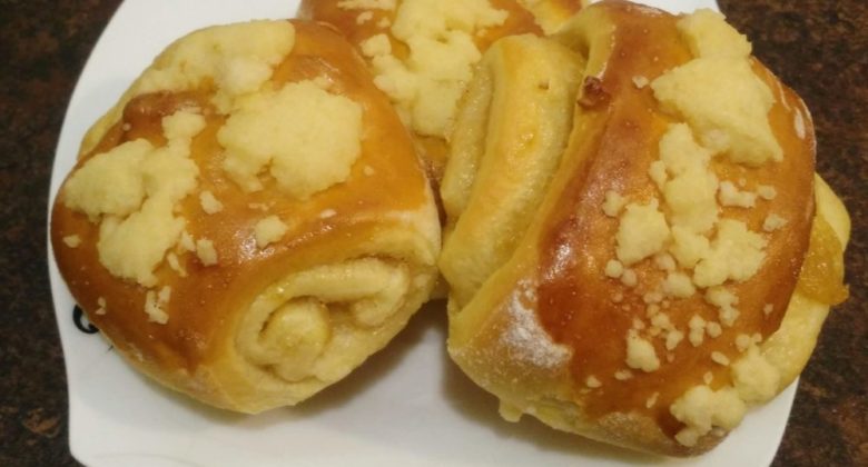Gdy ciasto nam wyrośnie zabieramy się za robienie drożdżówek. Odrywamy kawałek ciasta i rozwałkowujemy w prostokąt. Smarujemy dżemem i zwijamy w roladę. Tniemy na kawałki, układamy na blachę i odstawiamy do wyrośnięcia. Smarujemy jajkiem i posypujemy kruszonką (aczkolwiek nie trzeba).