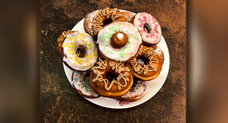 Wyrośnięte ciasto wykładamy na stolnicę i rozwałkowujemy na grubość ok. 7mm. Wykrawamy szklanką okręgi a na środku kieliszkiem albo rurką mniejszą dziurkę robimy.