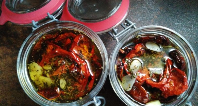 W sumie suszyły się ok 2,5 godz. Te co się ususzyły to wyjmowałam. Przygotowałam do nich zalewę. Wzięłam olej, oliwę z oliwek, łyżeczkę oregano, tymianku, bazylii i majeranku. Pokroiłam dwa ząbki czosnku. Oliwę z przyprawami podgrzałam, i wrzuciłam pomidory. Dokładnie wymieszałam i poczekałam aż wszystko się „zagotuje”, zacznie się pienić.