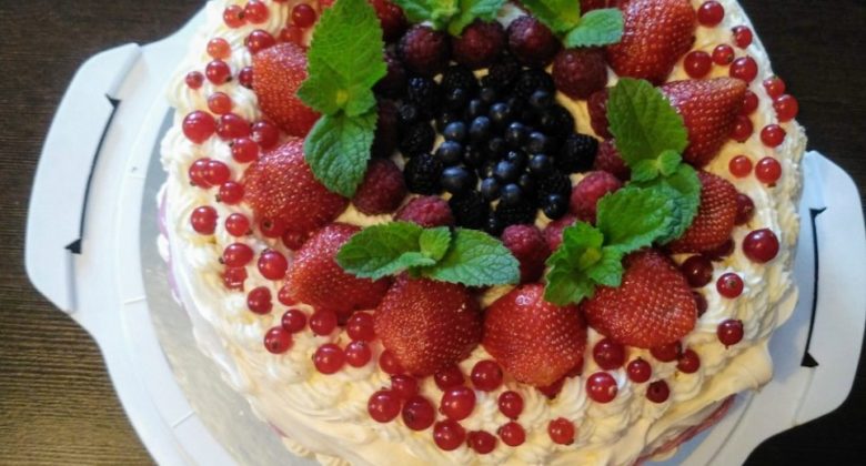 Blachę wstawiamy do piekarnika i pieczemy w 80 stopniach z termoobiegiem przez 2,5 godziny. Od czasu do czasu zaglądamy do bezy. Po tym czasie zostawiam bezę w piekarniku, wyłączam temperaturę i zostawiam termoobieg na ok 2 godziny. W tym czasie beza stygnie i dosycha. Do masy ubijam śmietankę 30% z mascarpone. Można również przekładać masą malinową, truskawkową czy też inną owocową. Ja preferuję masę malinową pomiędzy blaty i masę śmietanową na górny blat pod owoce.