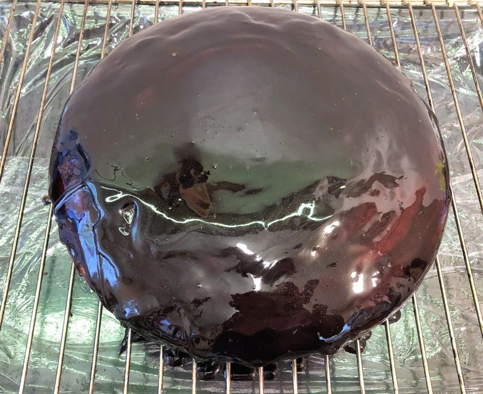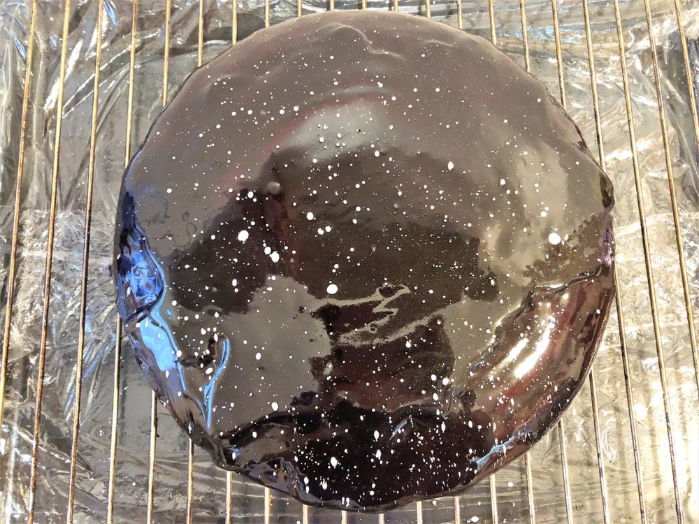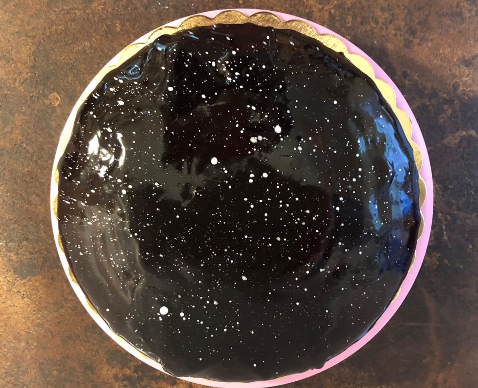 Możemy posypać cukrem pudrem lub polać polewą. U mnie jest błyszcząca polewa z żelatyną i efekt gwieździstej nocy 🙂
